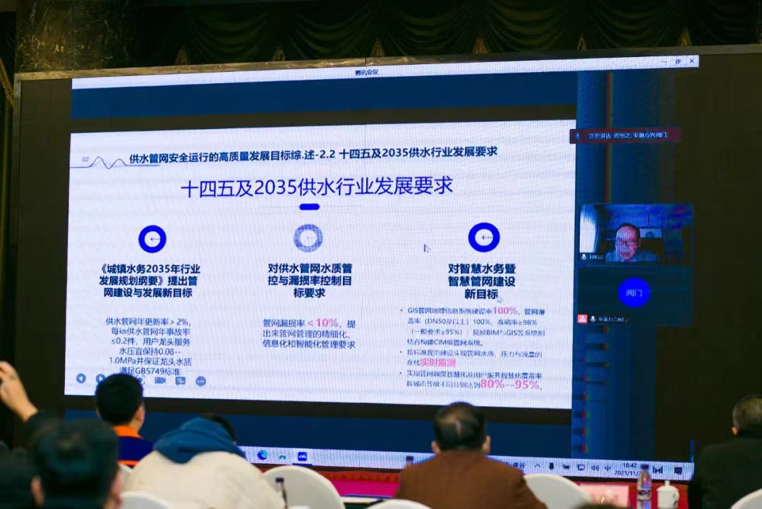 何相之教授則主要從當(dāng)前管網(wǎng)運(yùn)行風(fēng)險(xiǎn)、供水管網(wǎng)安全運(yùn)行的高質(zhì)量發(fā)展目標(biāo)、管網(wǎng)管理的信息化基礎(chǔ)建設(shè)和供水管網(wǎng)智慧化管理應(yīng)用實(shí)踐這四個(gè)方面對(duì)供水管網(wǎng)智慧化管理需求與大家進(jìn)行了分析討論,指出智慧管網(wǎng)建設(shè)應(yīng)當(dāng)依托行業(yè)標(biāo)準(zhǔn),重視供需互動(dòng)和立足于現(xiàn)場數(shù)據(jù)質(zhì)量,為供水企業(yè)提供統(tǒng)一性、互融性、共享性的信息管理平臺(tái)。何教授的發(fā)言對(duì)智慧管網(wǎng)的方法探究及實(shí)施路徑進(jìn)行了深度剖析,讓與會(huì)觀眾對(duì)管網(wǎng)智慧化建設(shè)有了新的認(rèn)識(shí)。